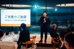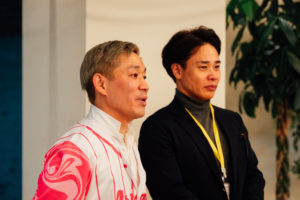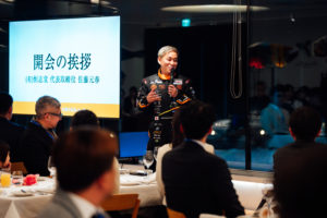 最後の締めは弊社代表の友人でレース仲間でもある清水宏保様にご登壇いただき、パーティは大盛況のまま幕を下ろしました。